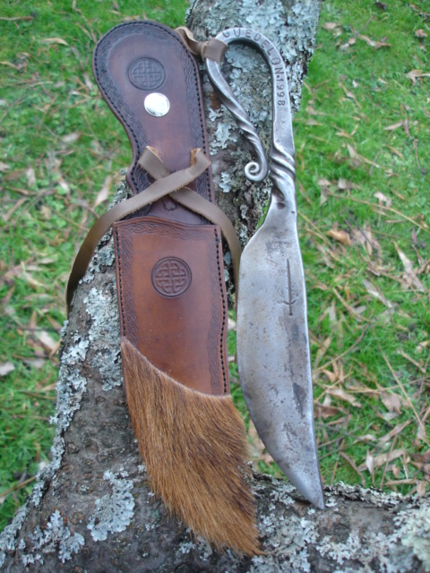 Couteau estampillé GUÉDÉLON, façonné par mon ami Joël; il m'a laissé libre-cours pour l'étui.