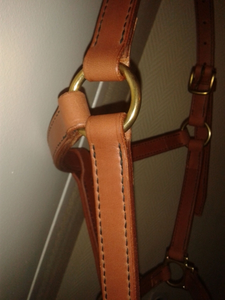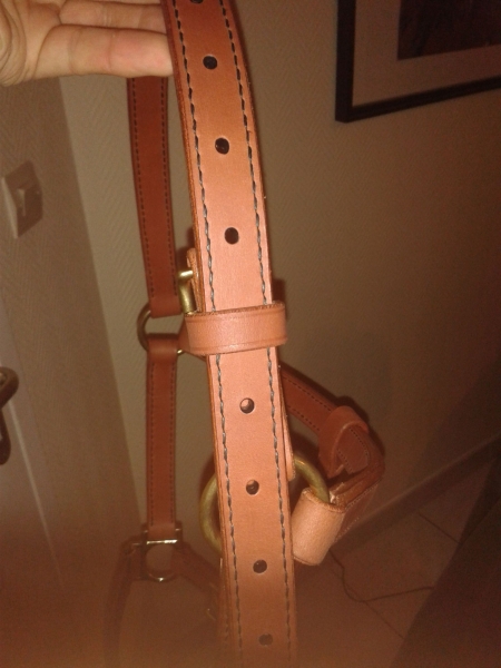 Pour l'autre licol, c'est un cuir tannage végétal acheté en chutes, mais qui doit être "traité, car il est déjà souple et assez gras. et là j'ai fait les tranches à la gomme arabique. c'était mon premier test, et je suis très content du résultat.