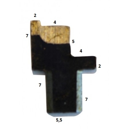 Voila une pièce coté en mm. Epaisseur 1 mm. Attention à ne pas oublier les chanfreins! Affutage du couteau et du doigt entraineur bilatéral.