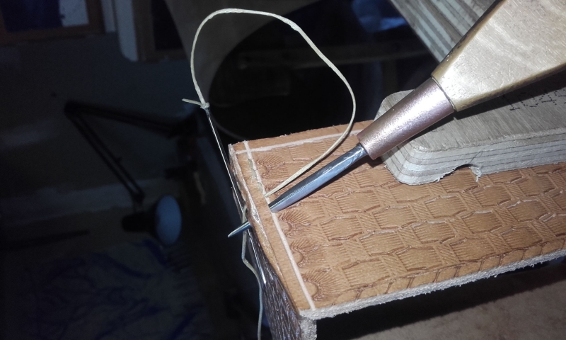 Une cale? Non... je me débrouille pour percer de la gorge d'un côté à celle de l'autre. Peut être qu'il faudrait utiliser alène et aiguilles courbes mais je n'ai jamais vu faire donc sait pas faire.