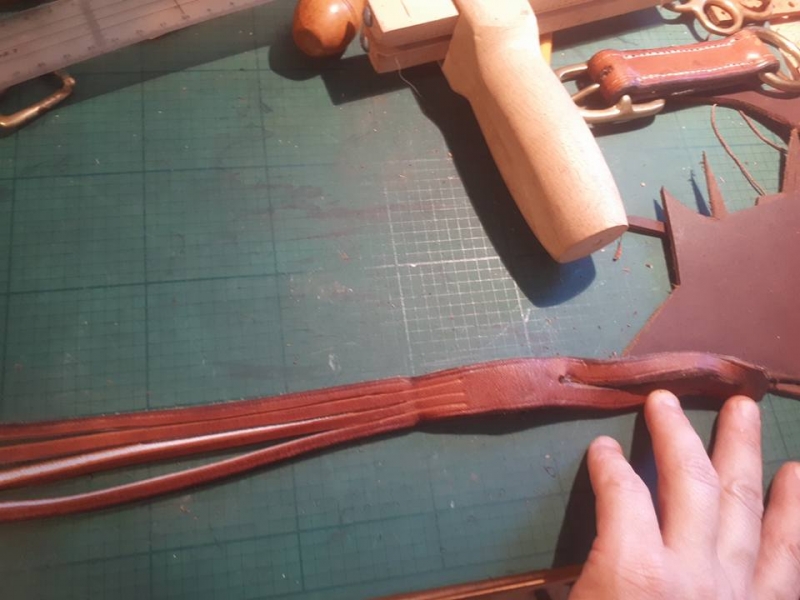J'ai une paire de rênes de 2m et j'ai voulu tenté les rênes tressées. Tressage 4 brins. 3 ça faisait gros, elles faisaient 20 de large et 5 petit et compliqué à couper.