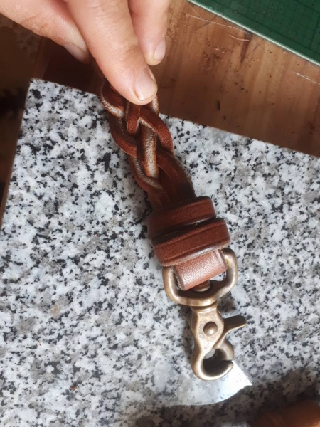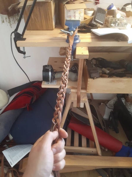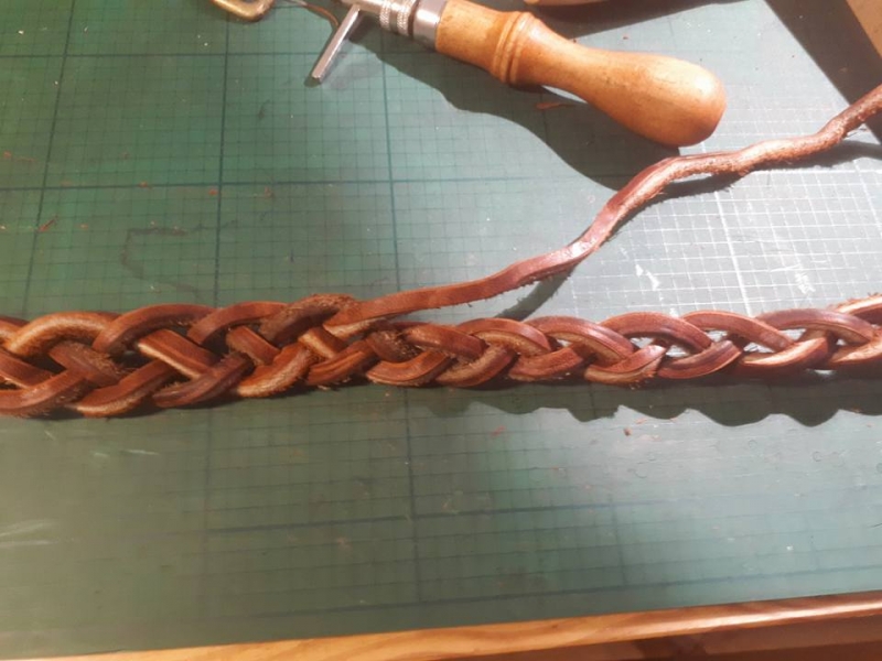 J'ai testé plusieurs systèmes de tressage et au départ, j'étais très dubitative sur le résultat final. Mon cuir est épais ( 4,5 cm), double tannage de chez Arnal, et ça demande bcp de force dans les mains pour tresser serré. Qui plus est ça se vrille. Mais après qq coups de marteaux sur la tête , la tresse est revenue à la raison et elles sont plus agréables à prendre en main que ce que ça semblait au départ ( très rigide).