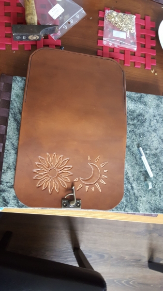 Bon, y a pas que le médiéval dans la vie, et en attendant d'aller prendre quelques conseil in vivo chez Leather Carver (ce que je ne manquerais pas ^^) je me suis lancé dans l'inconnu pour la confection d'un cadeau de Noël. Une "pochette" de 30x20 pour ma chère mère, dont le passe temps est le tirage de cartes (tarot de Marseille). Et il faut bien les ranger, ainsi que toutes ses notes. Et je me suis dit que c'était l'occasion de tester sur autre chose que 2 chutes de cuir la couture en point sellier.