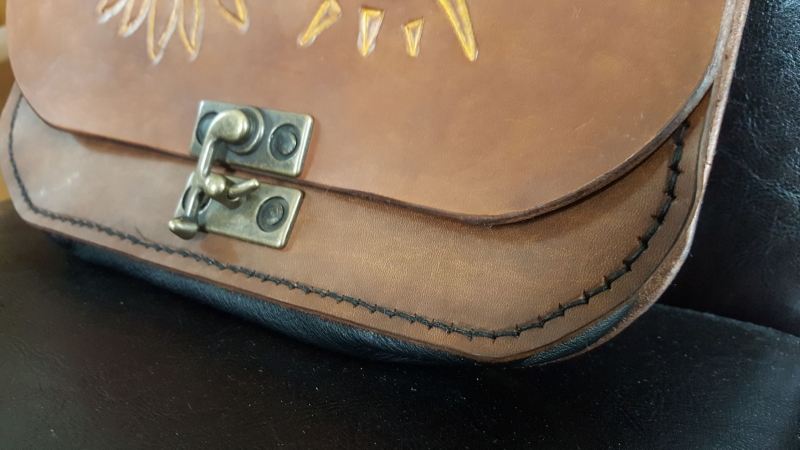 Par contre la couture des côtés et fonds......quand on débute, c'est long. Il m'aura fallu 5h pour tout assembler en pestant pour poser la dernière pièce alêne entre les dents et mes 2 aiguilles, faute sans doute de technique, et au fait d'avoir voulu faire la couture à l'intérieur... J'aurais pu faire une poche plutôt qu'une simple bande de vachette, mais j'ai préféré laisser l'intérieur en cuir brut. Au final, environ 15h de boulot, et un résultat perfectible (les arrondis pas rond, le repoussage, la couture, les bords) mais dont je suis quand même fier, na ! (et qui a été apprécié, ce qui est le plus important ! même si maintenant, elle se demande si elle ne va pas le prendre comme sac à main....et que mes frangines comptent me passer des commandes pour noel prochain